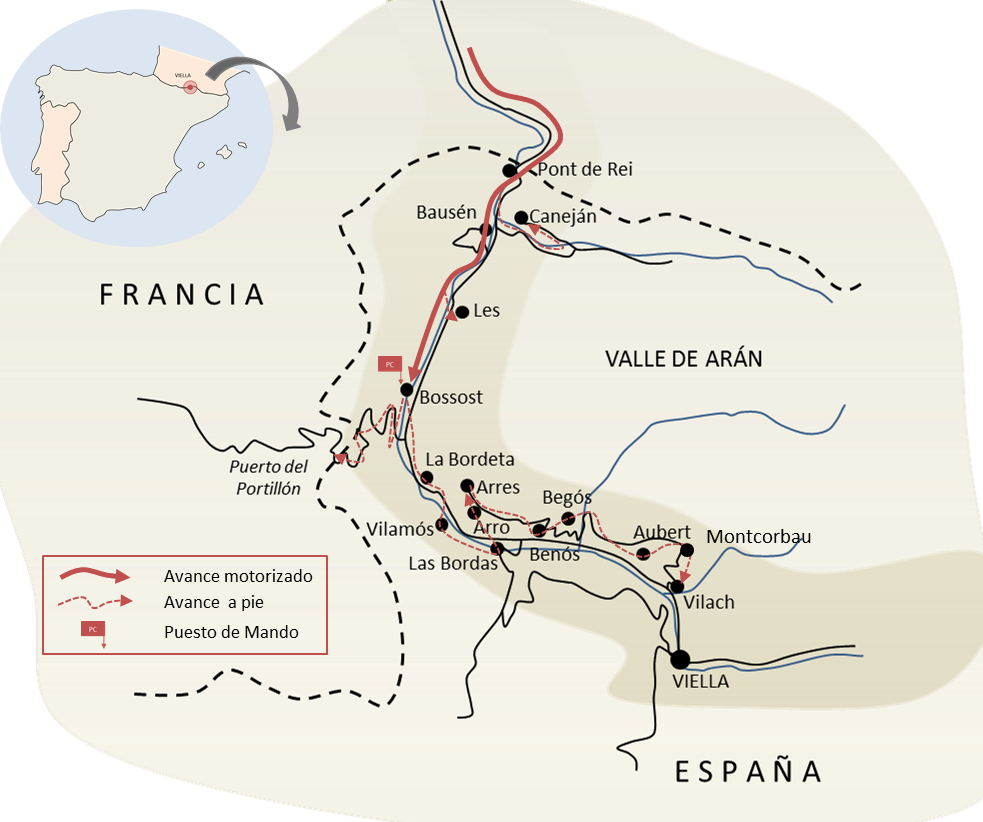 - El tunel de Viella estaba abierto pero de una manera provisional, por el no podían circular vehículos solo personal que lo atravesaba en unas vagonetas colgadas del techo, por lo que por esta vía no podía entrar en el Valle ni artillería ni carros de combate, de los que no disponían las tropas de montaña que se enviaron.
