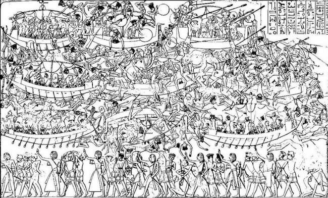 Fragmento de la batalla del Delta según los relieves del templo de Ramses III en Medinet-Habu. Las naves de los pueblos del mar son las de los extremos en formas de pico de ave. La escena recoge varias fases de la batalla: el comienzo del combate, el abordaje a las naves enemigas, el hundimiento de estas y la captura de los vencidos. En el fragmento completo se ve a la derecha a Ramses III (disparando flechas gigantescas) en la orilla junto a arqueros. La perdida de la pintura que cubría el relieve original ha supuesto por desgracia la perdida de muchos detalles.