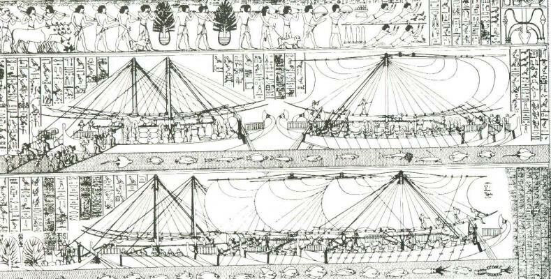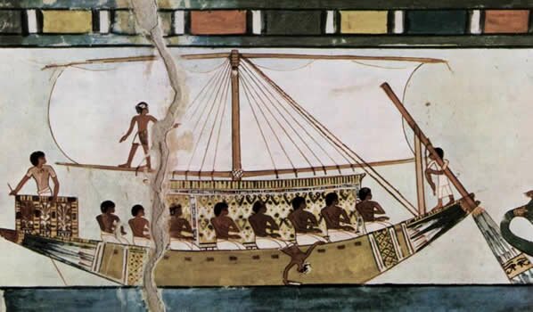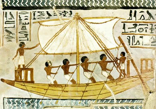 Al ser una civilización formada en torno al Nilo los egipcios pronto se echaron a navegar. Por un lado se desarrolló lógicamente una fuerte tradición fluvial. El Nilo no sólo era una fuente impresionante de recursos sino que era un río fácilmente navegable: se podía navegar en dirección norte siguiendo a la corriente; asimismo se podían aprovechar los vientos provenientes del norte para navegar hacia el sur con ayuda de una sencilla vela. Todo ello sin que fuera imprescindible recurrir a los remos, por lo que las primeras naves podían simplemente ayudarse de pértigas y paletas. No les costaría mucho a los egipcios concluir que además de transportar recursos por el Nilo, se podían transportar tropas rápidamente hasta los “puntos calientes” del Imperio para hacer frente a enemigos, rebeldes y/o bandidosi.