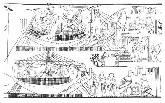 Barcos mercantes representados en la tumba de Kenamon (dinastía XVIII) (fuente: lakodaemon.co.uk). La tripulación de las naves parece sirio-cananita, lo que deja abierta la cuestión si el diseño de la nave es puramente levantino o también era compartido por los egipcios para el Mediterráneo.