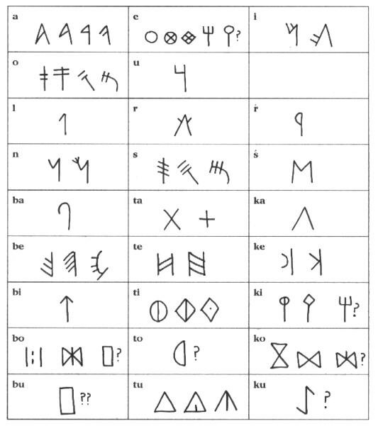 A partir de esto se ha podido establecer el sistema vocálico que consta de cinco vocales (/a/, /e/, /i/ /o/ y /u/) entre las cuales se estable una oposición del timbre. En cambio no parece existir una oposición de cantidad (vocales largas y breves). Existen dos signos ([n] y [m]) que corresponden a la nasal /n/, dos silbantes [s] y [ś] en las que parece establecerse la oposición sorda/sonora, dos vibrantes [r] y [ŕ], un fonema lateral /l/ y cinco oclusivas: dos dentales (/t/ y /d/), dos velares (/k/ i /g/) y una labial (/b/).