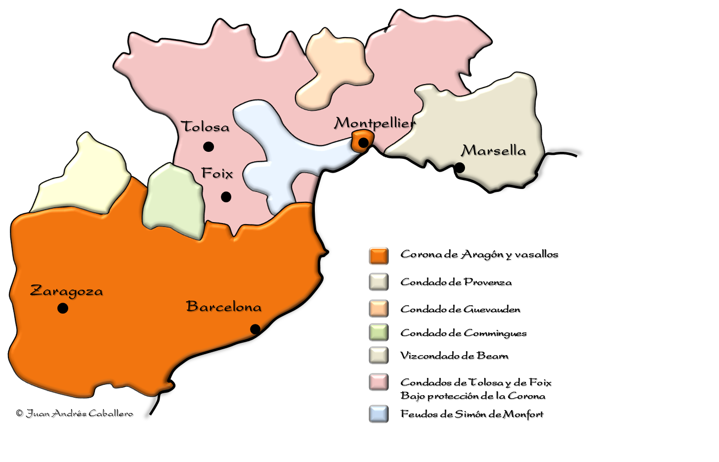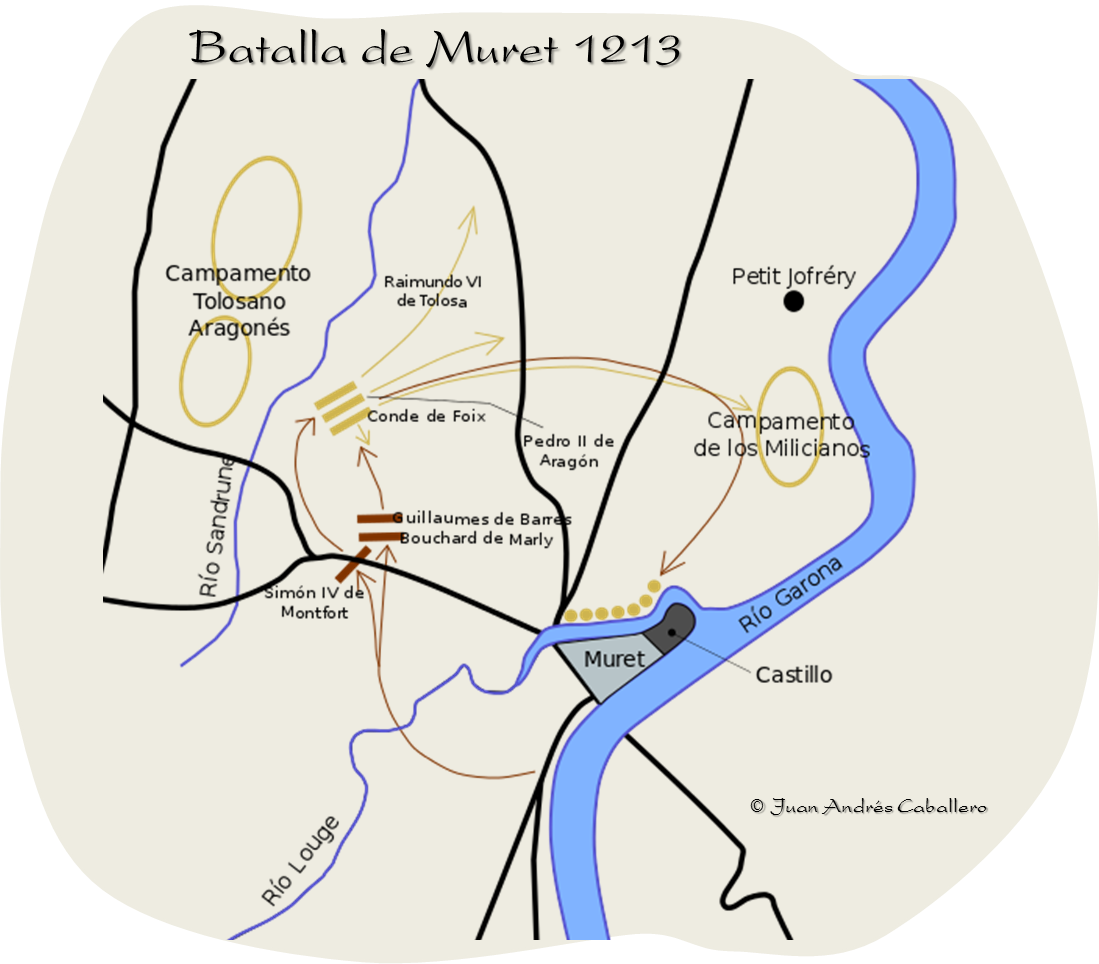 Pedro II se declaró protector de los señoríos occitanos amenazados y de Toulouse, vasallos suyos, aunque su hijo estaba bajo tutela de Simón de Monfort y pendía sobre él la excomunión decretada por el papa Inocencio III. Los ejércitos cruzados cercaron la ciudad de Muret y se enfrentaron, el 12 de septiembre de 1213, en la llanura de Muret donde murió el rey aragonés y propició el fin de la herejía cátara y de la influencia de la Corona de Aragón en el Mediodía francés. El historiador y arzobispo de Toledo, Rodrigo Jiménez de Rada resumía así la contienda: