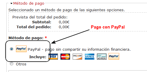 Se pueden seleccionar dos formas de pago diferentes: pago mediante PayPal o mediante Transferencia Bancaria (Otros), solo se activara en casos muy determinados, por lo general los pagos solo se efectuaran mediante PayPal. Las opciones de pago se pueden seleccionar antes de revisar el pedido y están situadas en el desplegable Método de Pago.