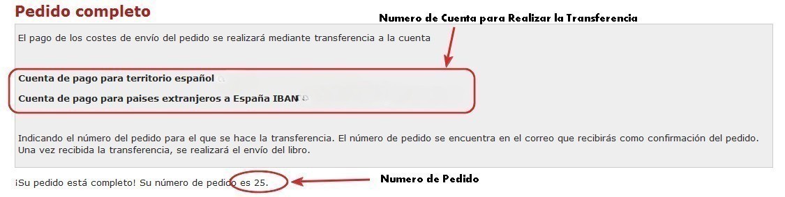 Si la forma de Pago elegida ha sido Otros, la pantalla a la que se accede muestra un mensaje con las instrucciones para realizar el pago mediante transferencia bancaria y el número de pedido: